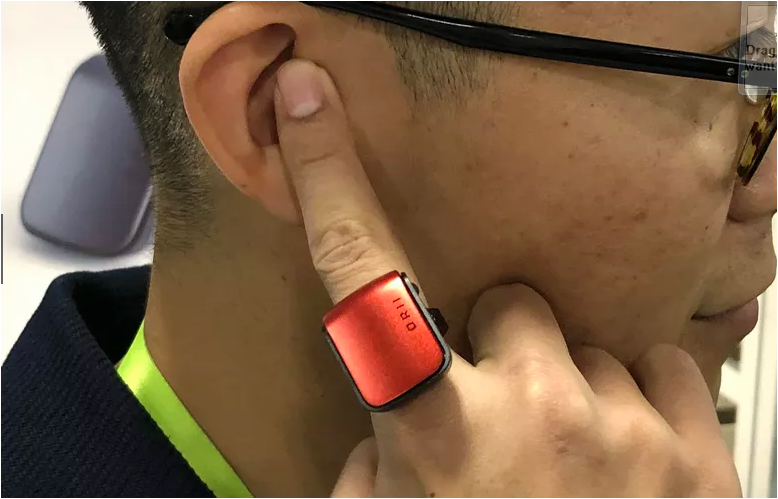 A bone-conduction ring that sends sound up your finger into your ear when you press your finger up against that spot you see in the picture. With it, you can take a call with your cell phone in your pocket.